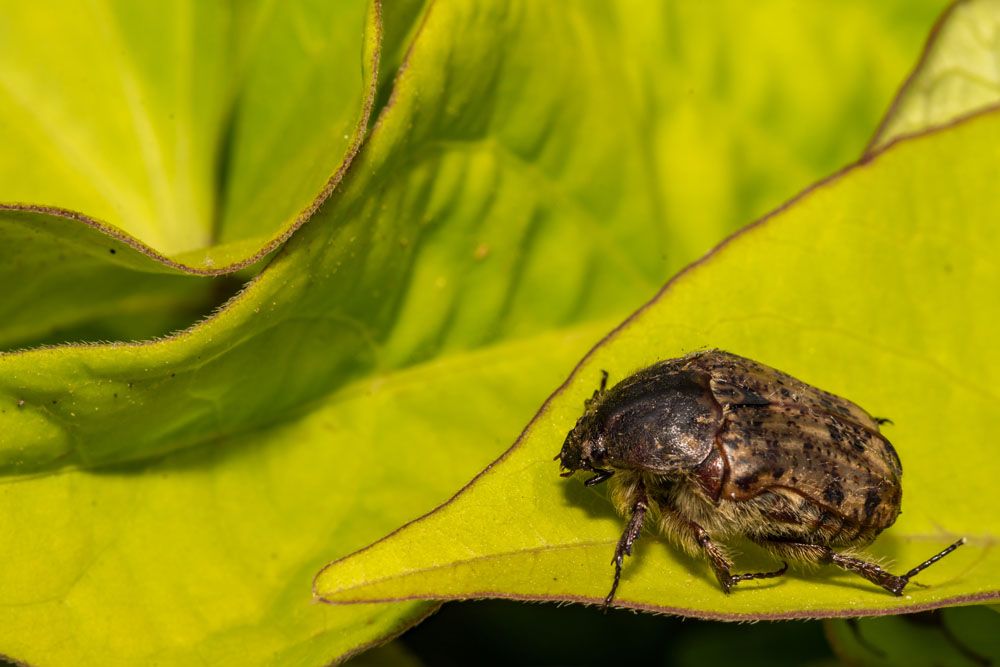 Appearance: These are roughly oval beetles that are 12-15 mm in length. The hue ranges from yellow-brown to dark reddish brown in general. The body is patterned with dark dots and is heavily coated in yellowish-brown hairs. Adults are powerful fliers that may generate an audible buzzing noise when flying.